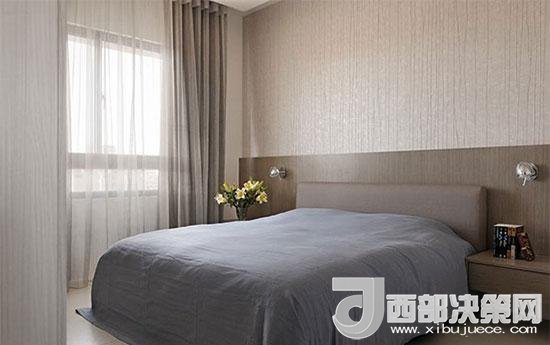 主臥以淺色立體壁紙與深色木皮墻面,深淺對比出沉靜地臥眠氛圍。