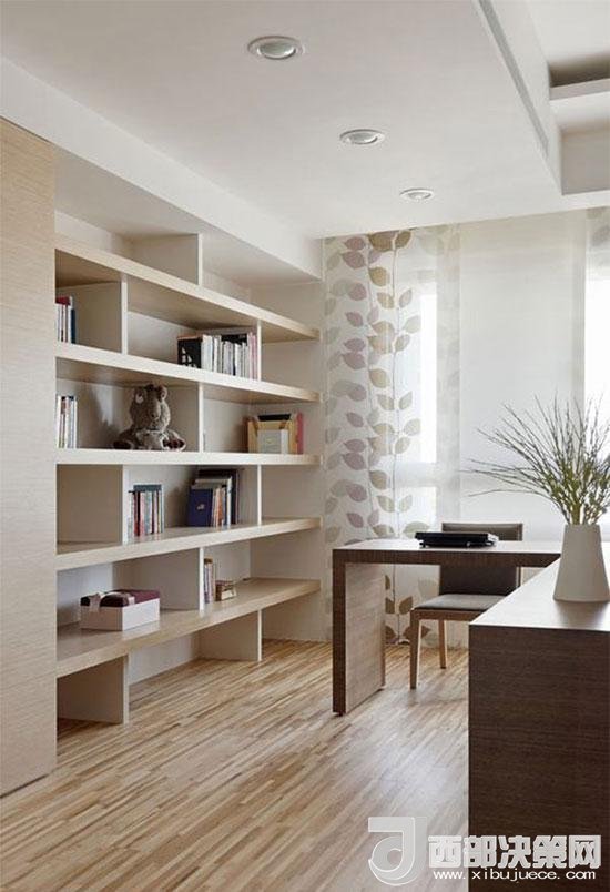 半開放式的書房空間,設(shè)計(jì)師利用梁下的空間規(guī)劃錯(cuò)落線條層架,層疊中見簡約美好。