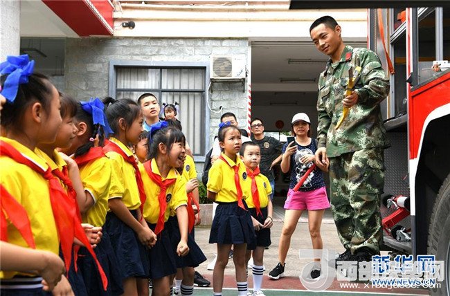6月2日,孩子們和家長(zhǎng)在廣西南寧市青秀區(qū)公安消防大隊(duì)柳沙中隊(duì)參觀消防車(chē),了解消防設(shè)備使用方法。