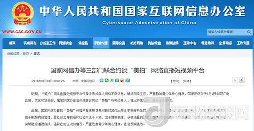北京6月4日電據(jù)國(guó)家網(wǎng)信辦官網(wǎng)消息,近期,“美拍”網(wǎng)絡(luò)直播短視頻平臺(tái)傳播涉未成年人低俗不良信息,破壞網(wǎng)絡(luò)生態(tài),嚴(yán)重影響青少年身心健康。國(guó)家網(wǎng)信辦于6月1日會(huì)同廣電總局、文化和旅游部、屬地網(wǎng)信辦依法依規(guī)聯(lián)合約談“美拍”相關(guān)負(fù)責(zé)人,提出嚴(yán)肅批評(píng),責(zé)令全面整改。