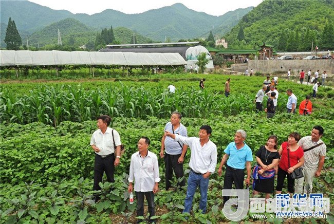 6月3日,安吉縣余村村民俞金寶(前左四)向參觀者介紹他創(chuàng)辦的生態(tài)農(nóng)業(yè)觀光園。新華社記者 譚進(jìn) 攝