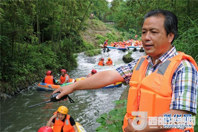 6月2日,安吉縣余村荷花山漂流景區(qū)創(chuàng)辦人胡加興(前)在巡查河道漂流安全狀況。新華社記者 譚進(jìn) 攝