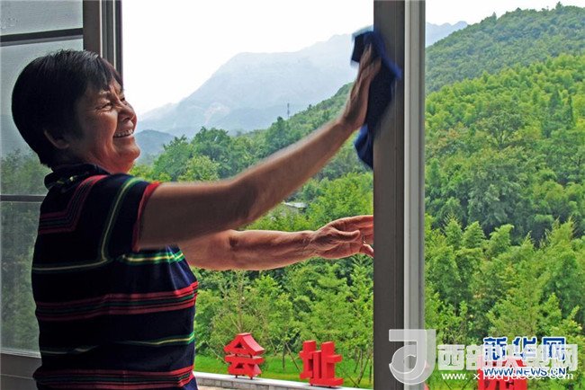 6月2日,安吉縣余村村民胡領(lǐng)珠在擦拭自家民宿客房的窗框。今年66歲的胡領(lǐng)珠和家人于2017年5月將自家農(nóng)房改造成民宿,1年多來(lái)接待游客1萬(wàn)多人次。新華社記者 譚進(jìn) 攝