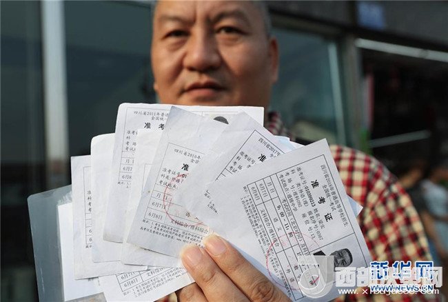 6月7日,梁實在展示歷年參加高考的部分準考證。新華社記者 江宏景攝