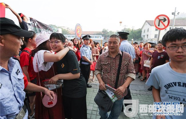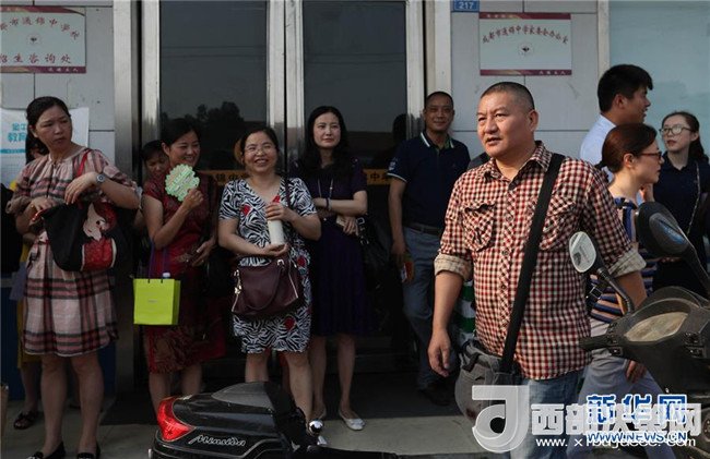 6月7日,在2018年高考成都通錦中學考點,梁實(前右)吸引考生家長的目光。新華社記者 江宏景攝