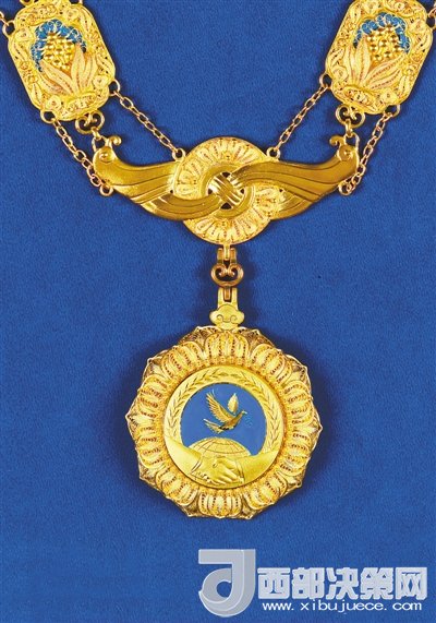 根據(jù)《中華人民共和國國家勛章和國家榮譽稱號法》,國家設(shè)立中華人民共和國“友誼勛章”。中華人民共和國“友誼勛章”章體以金色、藍色為主色調(diào),采用和平鴿、地球、握手、荷花等元素,章鏈采用中國結(jié)、萬年青、牡丹花、玉璧、蘭草等元素,整體采用花絲鑲嵌、掐絲琺瑯等傳統(tǒng)工藝手工制作。圖為中華人民共和國“友誼勛章”。新華社發(fā)