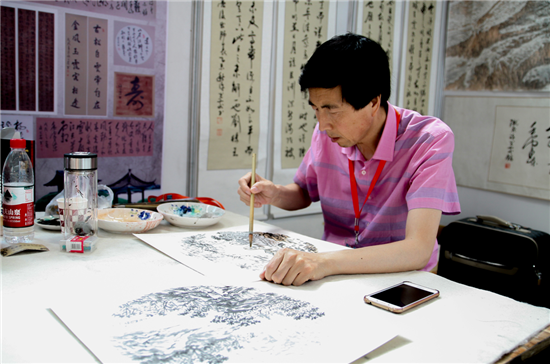 甘肅畫家盧旭東正在展會(huì)中心書畫展區(qū)創(chuàng)作國畫