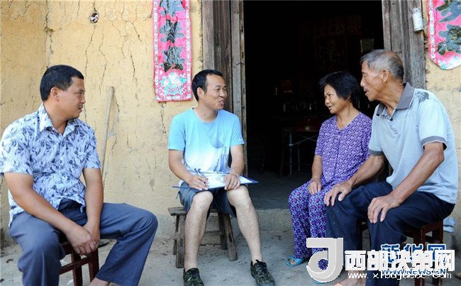 在江西永新縣三灣鄉(xiāng)三灣村,邢鐳(左二)在74歲的村民段老金家里了解土坯房改造情況(2013年8月10日攝)。邢鐳來自湖北,在三灣鄉(xiāng)扎根9年,2017年他剛剛帶領三灣鄉(xiāng)脫貧摘帽。新華社記者 周科 攝
