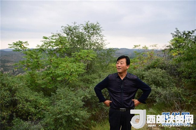 閆志雄在陜西延安市吳起縣南溝村的山坡上遠眺一片綠色的山林(2017年9月13日攝)。閆志雄帶領村民植樹造林,百折不撓,成為這個“退耕還林第一縣”的“綠色革命”先鋒。新華社記者 邵瑞 攝