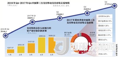 在移動(dòng)支付市場(chǎng)上,支付寶和擁有財(cái)付通、微信支付的騰訊金融雙寡頭局勢(shì)顯現(xiàn)。今年4月,易觀2017年第四季度中國(guó)第三方支付移動(dòng)支付市場(chǎng)數(shù)據(jù)顯示,第三方移動(dòng)支付市場(chǎng)交易規(guī)模為37.7萬(wàn)億元,環(huán)比增長(zhǎng)27.91%。其間支付寶和騰訊金融兩巨頭的份額分別為54.26%和38.15%,合計(jì)92.41%。