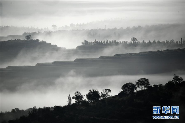 近日,寧夏固原市彭陽縣數(shù)十萬畝旱作梯田在曙光中迎來云海景觀,層疊的梯田間云霧繚繞,宛如仙境。據(jù)了解,彭陽縣自1983年建縣以來,始終堅持生態(tài)立縣的理念,積極推進植樹造林事業(yè),全縣林木保存面積由1983年的27萬畝,增長到目前的203.87萬畝,森林覆蓋率達到27.5%。記者王鵬攝