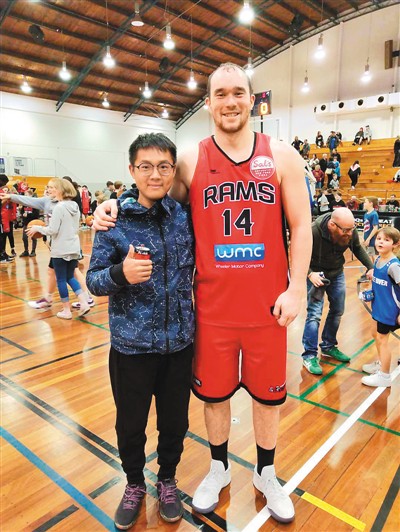 圖為吳宇森在新西蘭球館觀看籃球賽時和球員合影留念。