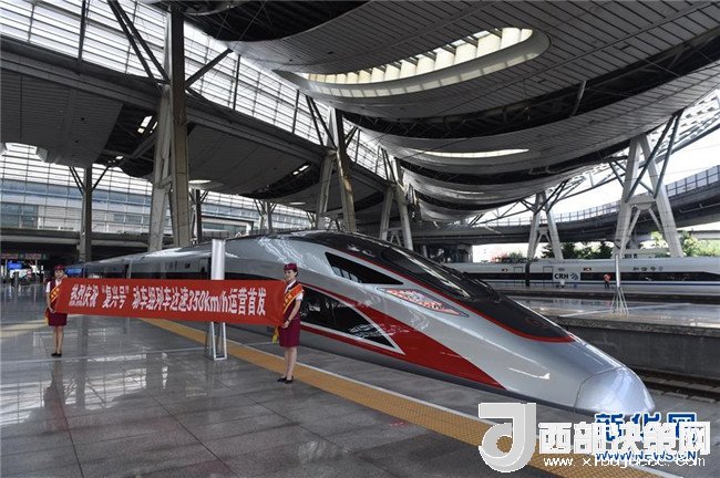 在北京南站拍攝的G13次“復(fù)興號”列車(2017年9月21日攝)。350公里時速的正式運營,標(biāo)志著我國成為世界高鐵商業(yè)運營速度最高的國家。新華社記者羅曉光攝