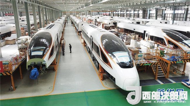 在位于吉林長春的中車長客股份公司高速動車組裝配車間里,幾列“復(fù)興號”中國標(biāo)準(zhǔn)動車組在進行裝配(2017年9月14日攝)。新華社記者張楠攝