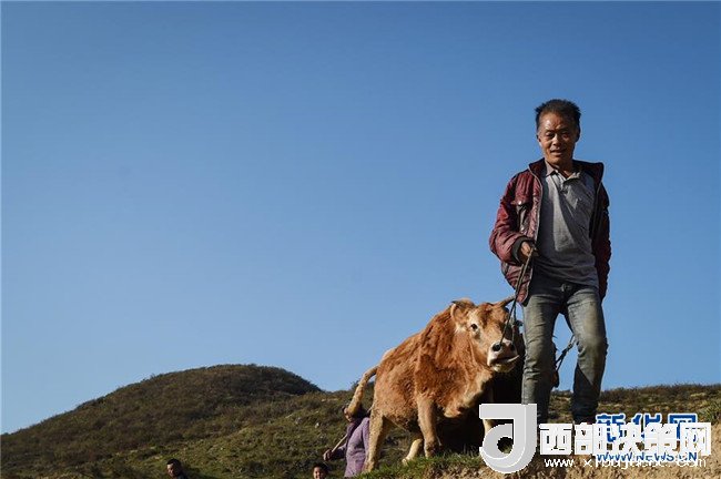 貴州畢節(jié)市七星關(guān)區(qū)長(zhǎng)春堡鎮(zhèn)埡關(guān)村農(nóng)民張祥印在放牛(2015年11月14日攝)。張祥印是當(dāng)?shù)氐呢毨簦昃兪杖胫挥幸磺Ф嘣?015年,七星關(guān)區(qū)推出精準(zhǔn)扶貧套餐,張祥印選擇了養(yǎng)牛,走上脫貧致富之路。新華社記者 歐東衢 攝
