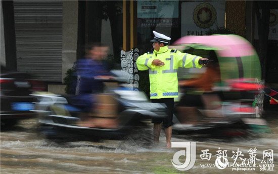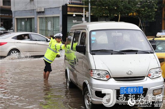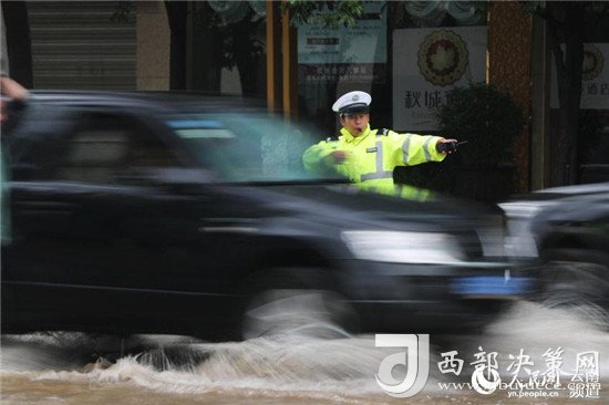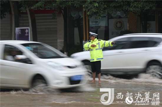 近日,云南昭通大雨導致街道積水嚴重,昭通中心城市鳳霞路與望海公園環(huán)湖北路交叉口積水最深處達50公分。一位交警赤腳冒雨在積水中指揮交通幫市民推車的畫面被市民抓拍下來,市民表示,交警赤腳在風雨中忙碌工作的身影令人難忘感動。 (徐前)