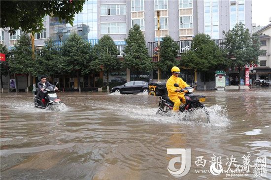 2018年8月4日,云南省昭通中心城市,在積水中行走的人員和車輛。攝影:張廣玉