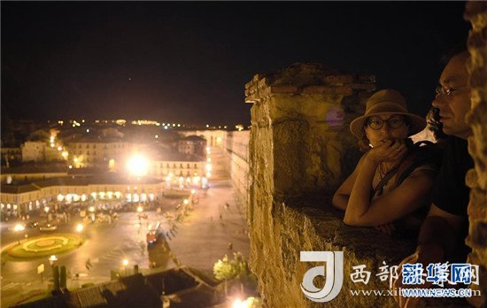 8月5日,在西班牙塞哥維亞,游客在觀景臺上欣賞古羅馬輸水道夜景。