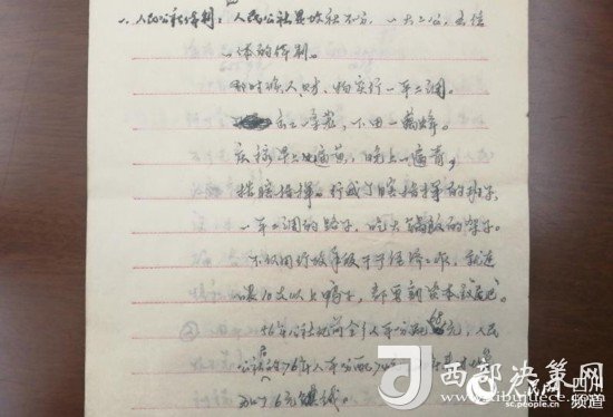 這本工作筆記內(nèi)頁紙上的字跡娟秀工整,細密地記錄著對人民公社的一些看法:“人民公社是政社不分、一大二公、五位一體的體制;出工一條龍,收工一窩蜂;不僅用行政手段干預(yù)經(jīng)濟工作,就連喂10只以上的鴨子都要割‘尾巴’……”。