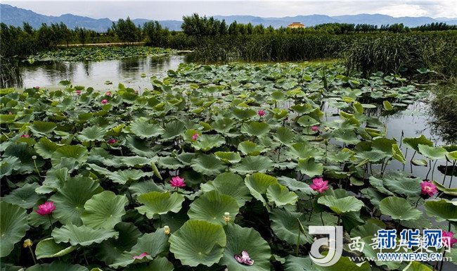 8月22日無(wú)人機(jī)拍攝的廣靈縣壺流河濕地盛開(kāi)的荷花。新華社記者 陶明 攝