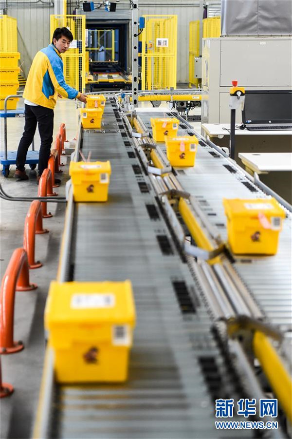 在江蘇南京蘇寧云倉物流基地,工作人員將包裝好的“共享快遞盒”放到傳送帶上,準(zhǔn)備進(jìn)行分揀運(yùn)輸(2017年10月31日攝)。新華社記者 李博 攝