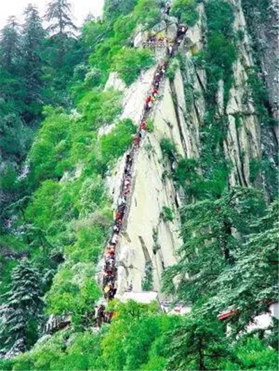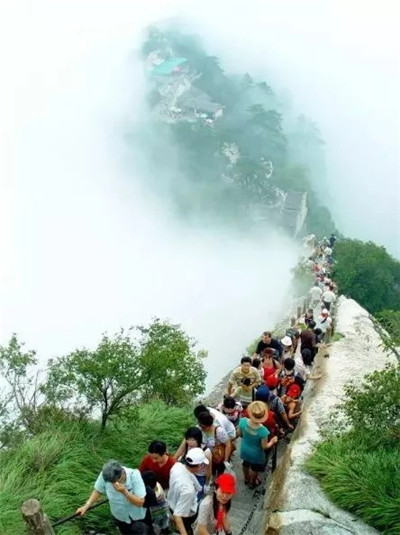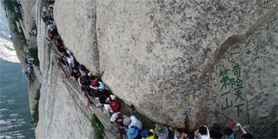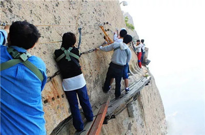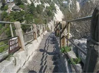 具有700多年歷史的長(zhǎng)空棧道,在華山南峰東側(cè)山腰的萬(wàn)仞絕壁上鑿出來(lái)的幾個(gè)踏腳之處,鑲嵌石釘搭木椽搭建了一個(gè)百余米懸空的棧道,讓人望而卻步,如果你有恐高癥,僅僅看一眼都會(huì)讓你驚恐萬(wàn)分。2013年,著名旅游網(wǎng)站“Smarter Travel”盤(pán)點(diǎn)全球最恐怖懸崖步道,將華山長(zhǎng)空棧道列為全球十大最恐怖的懸崖步道之一。