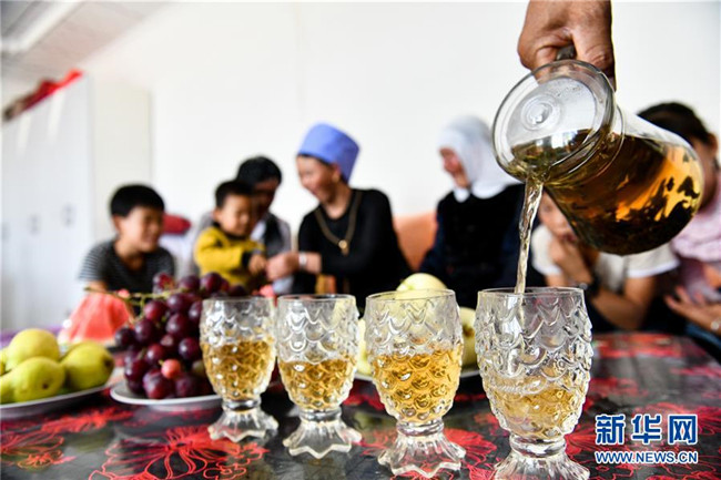 在中寧縣喊叫水鄉(xiāng)賀家口子村賀金文家,賀金文在為家人倒茶(9月6日攝)。新華社記者 郭緒雷 攝