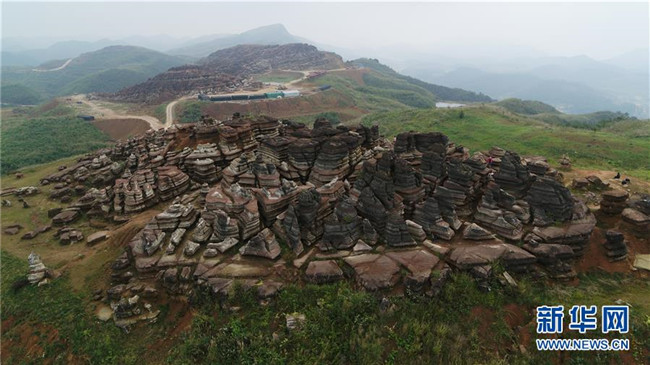 9月16日拍攝的貴州省松桃苗族自治縣盤(pán)石鎮(zhèn)紅石林景觀(無(wú)人機(jī)拍攝)。