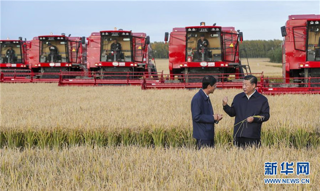 9月25日至28日,中共中央總書記、國(guó)家主席、中央軍委主席習(xí)近平在東北三省考察,主持召開深入推進(jìn)東北振興座談會(huì)。這是25日下午,習(xí)近平在黑龍江農(nóng)墾建三江管理局七星農(nóng)場(chǎng)萬(wàn)畝大地號(hào),察看秋稻收獲情況并同收割機(jī)駕駛員親切交談。 新華社記者 謝環(huán)馳 攝