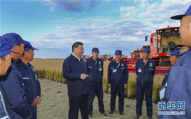 9月25日至28日,中共中央總書記、國(guó)家主席、中央軍委主席習(xí)近平在東北三省考察,主持召開深入推進(jìn)東北振興座談會(huì)。這是25日下午,習(xí)近平在黑龍江農(nóng)墾建三江管理局七星農(nóng)場(chǎng)萬(wàn)畝大地號(hào)與農(nóng)場(chǎng)工人們親切交談。 新華社記者 謝環(huán)馳 攝