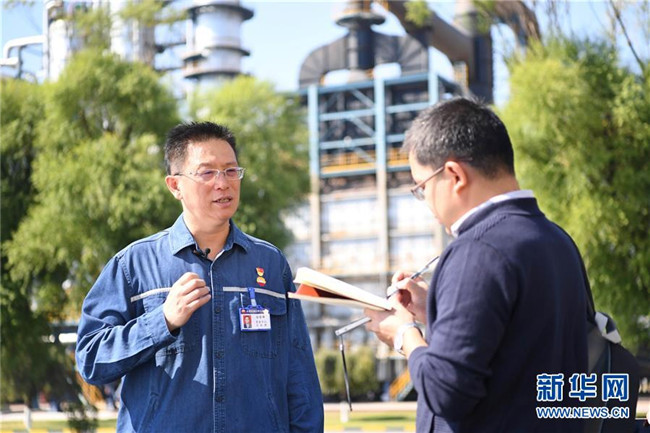 中國石油遼陽石化公司總經(jīng)理、黨委書記白雪峰向記者介紹情況(9月27日攝)。新華社發(fā)(龍雷攝)
