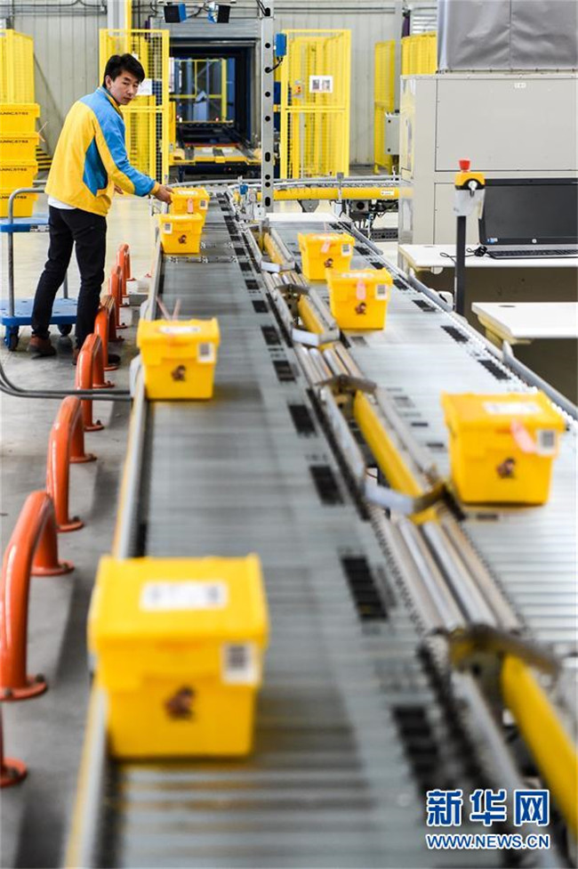 在江蘇南京蘇寧云倉物流基地,工作人員將包裝好的“共享快遞盒”放到傳送帶上,準(zhǔn)備進(jìn)行分揀運(yùn)輸(2017年10月31日攝)。新華社記者 李博 攝