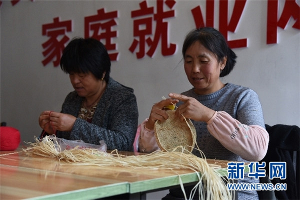 鹽灘村村民在手工編織扶貧車間編織草帽。新華社記者王朋 攝