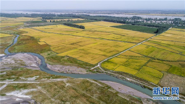 這是在地處阿克蘇河上游的溫宿縣托甫汗鎮(zhèn)阿亞克其村拍攝的一處由生態(tài)防護林守護的稻田(9月23日無人機拍攝)。新華社記者 胡虎虎 攝