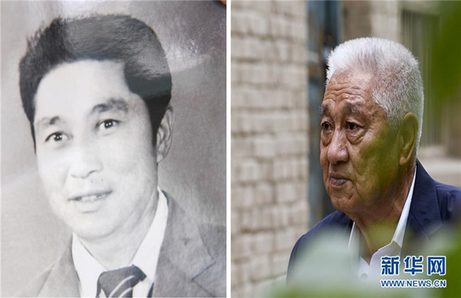 拼版照片:左圖為柯柯牙林管站第一任站長依馬木·麥麥提調(diào)任林管站長時的照片;右圖為已退休的依馬木·麥麥提向記者講述柯柯牙綠化工程(9月22日攝)。新華社記者 胡虎虎 攝