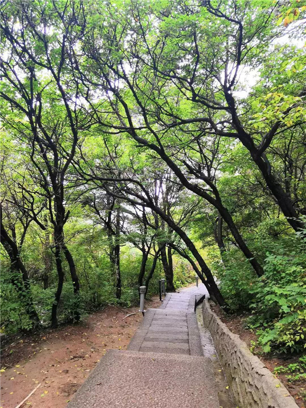 清晨,陽光穿過樹林灑在石階上,斑駁的光影隨風(fēng)自在地?fù)u晃。茂密的樹林蒸騰起無數(shù)看不見的水汽,溫潤的撲在臉上,令人心曠神怡。