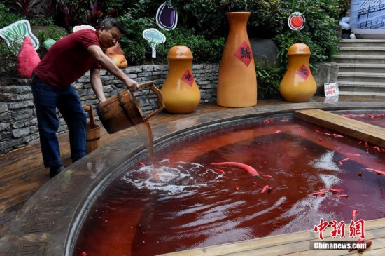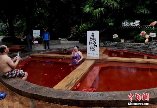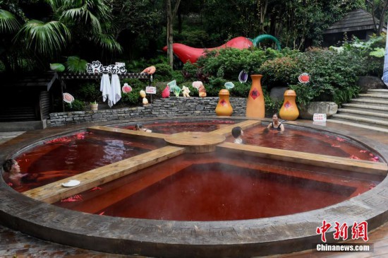 10月18日,市民正在泡“火鍋”溫泉。重慶一溫泉近期推出“奇妙的紅湯池”,直徑6.7米的圓形湯池被改造成一口4格“鐵鍋”,配上紅色的溫泉,如同巨型麻辣火鍋。“火鍋”溫泉湯池里的“火鍋底料”是用雞血藤、艾葉、紅花、首烏等中藥材加上紅酒熬制而成,對(duì)人體有一定保健功能。湯池周邊還陳列著鹽罐、油碟、午餐肉、啤酒瓶等裝置,水上漂浮著辣椒道具共同營(yíng)造出麻辣火鍋的濃烈氣氛。 中新社記者 周毅 攝