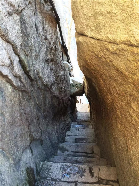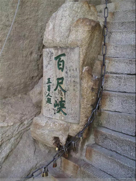 “千尺幢”在華山峪古道“回心石”上,是經(jīng)華山峪登主峰的必經(jīng)之道。這里原為一崖間裂隙,直立70度,后來人們沿隙鑿?fù)爻陕?,有石階370級(jí),階寬僅容半足,游人登臨時(shí),仰視一線天,俯視若臨深井。