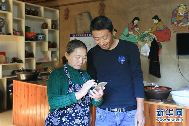 夏永春與妻子用手機(jī)查看訂單(10月10日攝)。貧困戶夏永春兩口子靠著地道鄉(xiāng)土手藝,在山東蘭陵縣金嶺鎮(zhèn)壓油溝風(fēng)景區(qū)里開了一家農(nóng)家特色咸菜坊,年收入一下躥升到七八萬(wàn)元。新華社記者 王南 攝