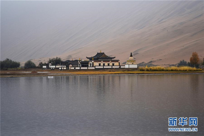 巴丹吉林廟位于名為“廟海子”的湖泊旁(10月19日攝)。 巴丹吉林沙漠位于內(nèi)蒙古西部阿拉善盟,是中國(guó)第三大沙漠,沙丘起伏的曲線陡變成高聳的沙山,碧藍(lán)的湖泊散落在沙海間。 新華社記者 李仁虎 攝