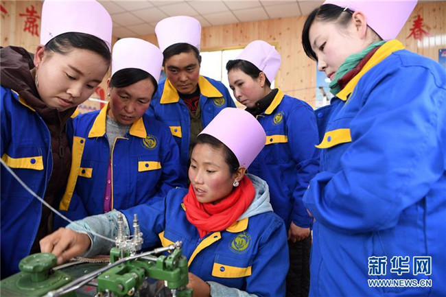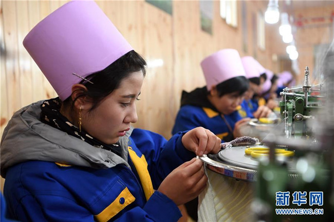 11月6日,在東鄉(xiāng)族自治縣大樹鄉(xiāng)“扶貧車間”,留守婦女向熟練工(中)學習操作技巧。