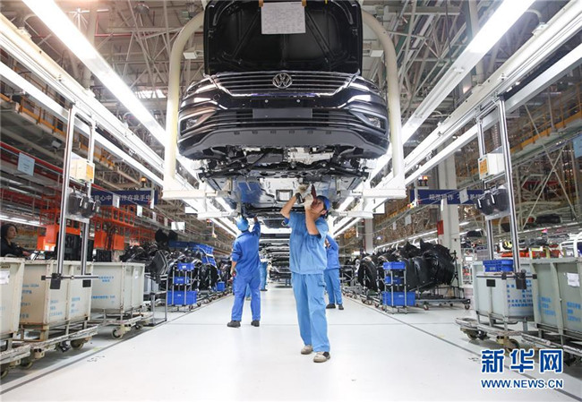 在位于嘉定的上汽大眾生產(chǎn)車間內(nèi),工作人員在生產(chǎn)線上安裝汽車底盤(10月30日攝)。 新華社記者 丁汀 攝