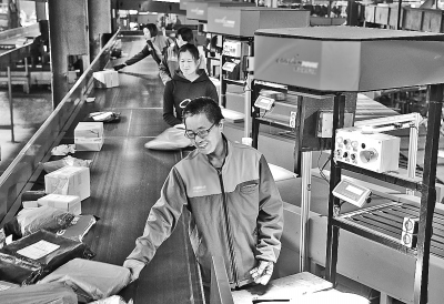 11月11日,工作人員在江蘇省南通市一家快遞公司分揀系統(tǒng)旁忙碌。國(guó)家郵政局預(yù)計(jì),今年“雙11”期間,全行業(yè)處理的郵件、快件業(yè)務(wù)量有望超過(guò)18.7億件,最高日處理量是平日的3倍。新華社發(fā)(許叢軍攝)