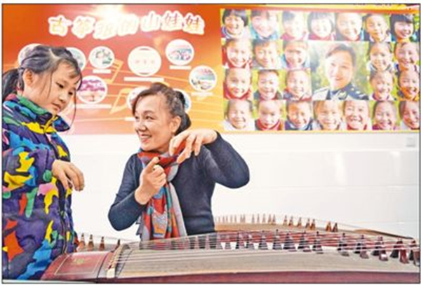 安徽省金寨縣梅山鎮(zhèn)小南京村“山娃娃古箏班”創(chuàng)辦4年來(lái),為三十幾名留守兒童帶來(lái)溫暖。創(chuàng)辦人俞曉冬原為南京軍區(qū)前線文工團(tuán)國(guó)家一級(jí)古箏演奏家。2014年,她自籌資金20多萬(wàn)元購(gòu)置40多架古箏,在小南京學(xué)校建起一間古箏教室,利用音樂(lè)課、課余和周末時(shí)間無(wú)償對(duì)山村留守兒童進(jìn)行古箏培訓(xùn)和音樂(lè)教育。一年中,俞曉冬有150多天都住在學(xué)校,與山娃們朝夕相處,孩子們親切地稱(chēng)她為“古箏媽媽”。一批批山娃娃在小學(xué)畢業(yè)前通過(guò)全國(guó)器樂(lè)水平十級(jí)考試,還多次參加國(guó)內(nèi)公益演出。圖為俞曉冬老師在教留守兒童學(xué)古箏。(趙樹(shù)宴/攝)