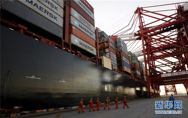 工人列隊走過一艘停泊在洋山深水港碼頭的集裝箱船(2017年9月13日攝)。新華社記者方喆攝