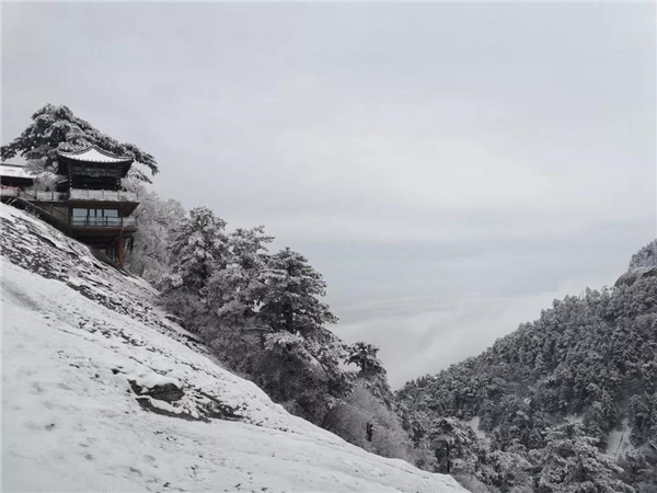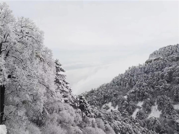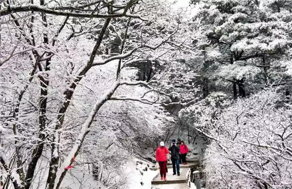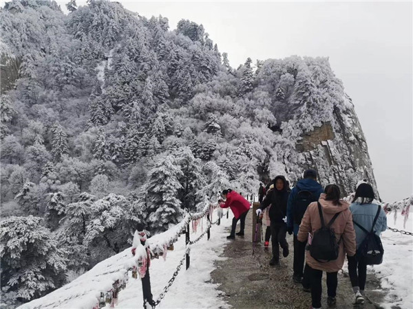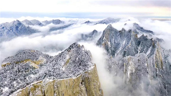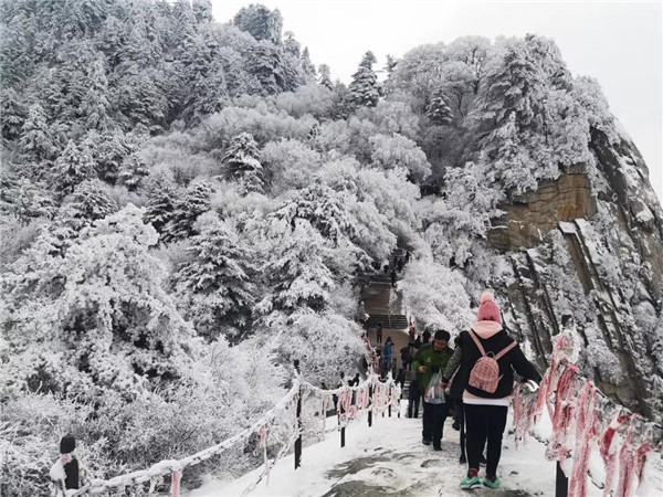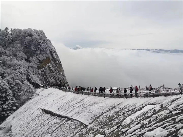 17日凌晨的一場大雪將西岳華山變成白雪皚皚的世界,白雪與蒼翠的華山奇松、靈動的云海交相輝映,如夢如幻;滿山遍野玉樹瓊花,樹枝上通體的霧凇晶瑩剔透,繪就冬日畫境,美不勝收,游人如置身人間仙境。