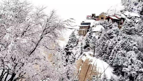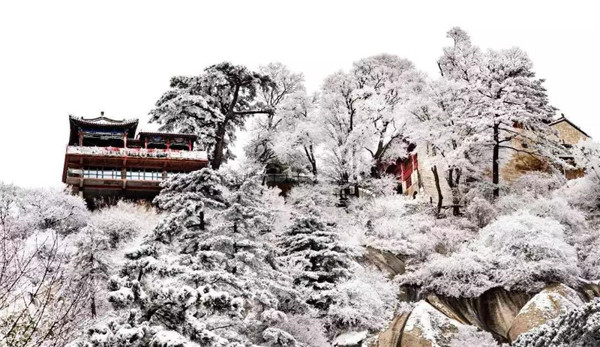 冬天的雪景——千峰筍石千株玉,萬樹松蘿萬朵銀。華山的雪景不僅是銀白的世界,而是猶如千姿百態(tài)的雪雕。雪霽,便有“林海玉樹”、“雪堆玉石”、“云中雪龍”、“巖崖雪屋”、“梨花飛揚(yáng)”、“天女散花”、“紅帶玉墜”等各具形態(tài)的奇特景觀。置身在雪的境界,神清氣爽,洗心革面,冰清玉潔,忘卻凡塵。