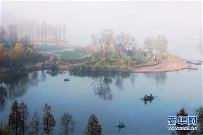 當(dāng)日,貴陽(yáng)市出現(xiàn)大霧天氣,閱山湖公園內(nèi)的霧氣、林木、湖水呈現(xiàn)出一幅美麗的冬日畫(huà)卷。新華社記者 劉續(xù) 攝