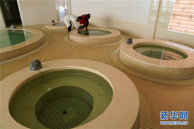 西藏自治區(qū)藏醫(yī)院風(fēng)濕病防治研究羊八井基地工作人員在查看藥浴池子(2018年11月21日攝)。新華社記者普布扎西攝