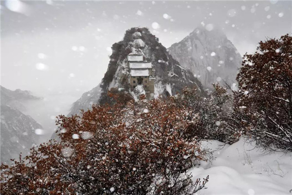 華山在11月下旬進(jìn)入冬季,12月至次年3月是華山雪季。游客可欣賞到難得一見的華山雪景——美麗的霧凇給樹木、巖石、屋舍都披上一層晶瑩的薄衣,尤其在大雪覆蓋后,山景變成一幅曼妙的白色圖畫,峰上的樹木和古藤被透明的冰層包裹,極富魅力。